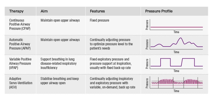 * Hinweis: ASV-Therapie ist kontraindiziert bei Patienten mit chronischer symptomatischer Herzinsuffizienz (New York Heart Association 2 – 4) mit reduzierter linksventrikulären Ejektionsfraktion (LVEF _ 45 %) und mässiger bis schwerer prädominant zentraler Schlafapnoe.