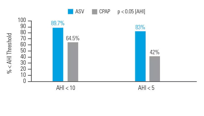 In einer Intention-to-treat-Analyse wurde nach 90 Tagen Therapie bei 89,7 % der mit ASV behandelten Patienten ein Behandlungserfolg erzielt (Apnoe/Hypopnoe-Index [AHI] < 10) im Vergleich zu 64,5 % bei den mit CPAP therapierten Teilnehmern.6