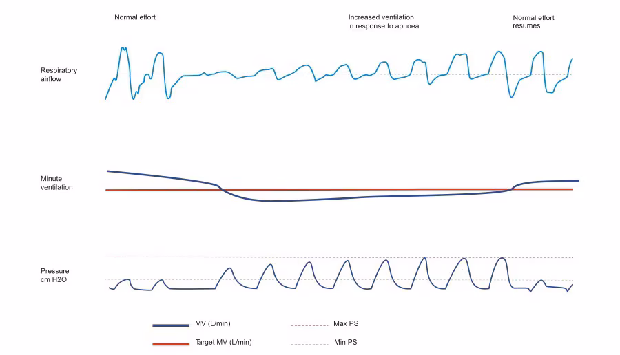 - Die Druckunterstützung wird erhöht, wenn das Atemminutenvolumen unter das Zielminutenvolumen fällt, und herabgesetzt, wenn das Atemminutenvolumen das Zielminutenvolumen wieder erreicht.