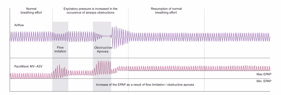 PaceWave ist der bewährte Algorithmus für die adaptive Servoventilation, der sich von Atemzug zu Atemzug auf das Atemminutenvolumen des Patienten einstellt.